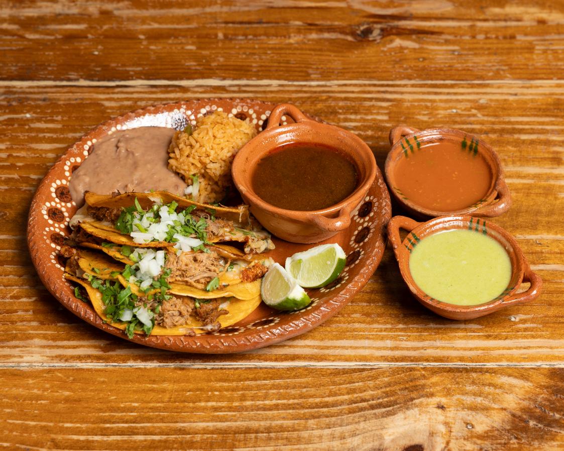 Three corn tortillas rolled tightly, choice of filling (shredded chicken, carnitas or birria), and then deep-fried until crispy. Garnished with lettuce, crema and cotija cheese. Served with refried beans and mexican rice.